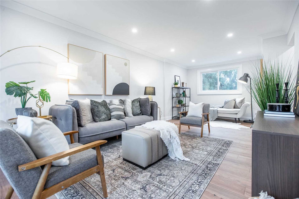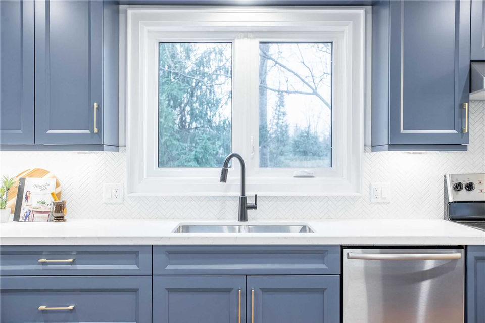This renovation transformed the home into a bright, contemporary haven with a refined, cohesive style. The kitchen features blue cabinetry accented with sleek brass hardware, a white quartz countertop, and a herringbone tile backsplash—creating a perfect balance of color and texture. Warm hardwood floors run throughout, tying each space together and adding an inviting feel. The living areas are styled with soft, neutral tones and layered textures, offering a cozy yet sophisticated atmosphere. Updated bathrooms feature clean lines and timeless finishes, including a frameless glass shower with marble-inspired tile. From the welcoming front entry to the airy upper hallway, every detail was thoughtfully designed to enhance functionality while elevating the home’s aesthetic.